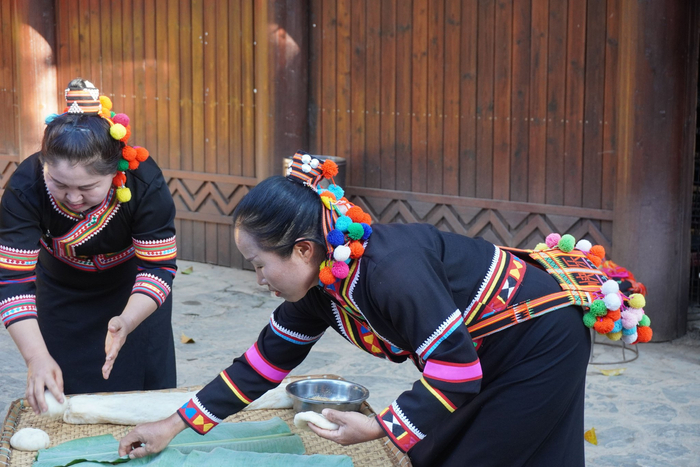 当落日的余晖洒上拉祜族传统的杆栏式建筑,村民又再次聚在一起。“我去摘几片新鲜的芭蕉叶。”“我们准备糯米和芝麻。”“我力气大,我来负责打!”大家迅速找好自己的“定位”,为舂粑粑做好准备。“粑粑意为团团圆圆,是拉祜族年节里不可缺少的重要习俗。”李石开一边向围观的游客介绍,一边用木棍上下捶打着碓窝中的糯米。待糯米变得细腻,大家便一起将其揪成等份在芭蕉叶上揉成饼状。一句句祝福伴随着一个个圆圆的粑粑被送到远道而来的客人手中。欢笑声、鼓劲声、歌声交织出浓厚的节日氛围。