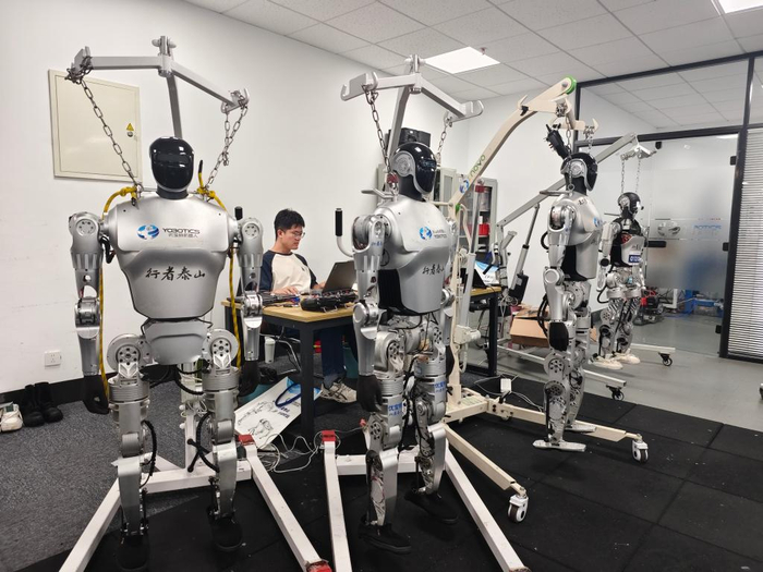 春节期间人形机器人大火,开工首日,山东优宝特智能机器人有限公司研发与生产节奏迅速恢复至满产状态。算法实验区内,工程师们正迭代优化四足机器人的运动控制参数;测试跑道上,型号Y30的四足机器人加紧练习新技能;装配工位上,人形机器人“行者泰山”的组装热火朝天;成品区内,一批即将交付的机器人整装待发,即将交付应用于智能导览、警务安防等场景。