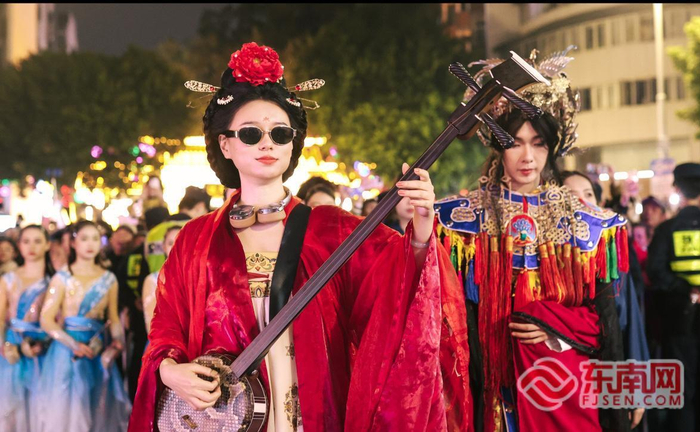 巡游中的00后抖音创作者@陈楚念是福州本地人,他在海外留学时将布袋木偶戏等传统戏剧与现代机械舞融合,单条视频收获超500万赞。作为非遗创新的代表,此次他身着融合簪花元素的服饰亮相千灯方阵,表现非遗风格机械舞,助古老非遗焕发新生。
