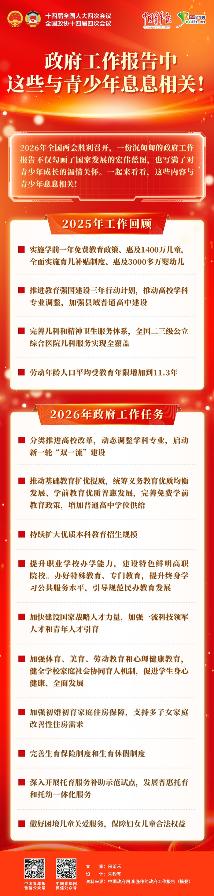 十四届全国人大四次会议开幕。一份沉甸甸的政府工作报告不仅勾画了国家发展的宏伟蓝图,也写满了对青少年成长的温情关怀。一起来看看,这些内容与青少年息息相关!(记者 田昕禾 朱钧有)