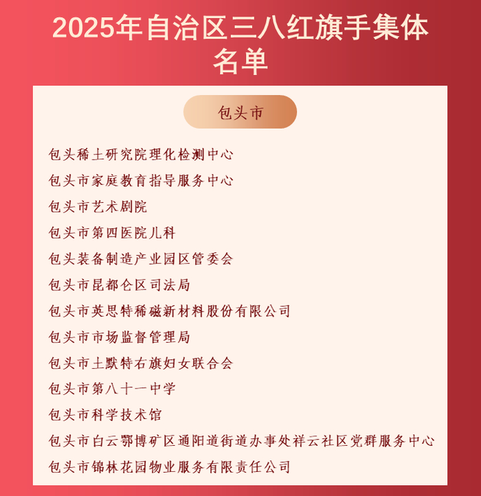 另外,包头市20名个人、29个集体荣获2025年度自治区三八红旗手标兵、三八红旗手、三八红旗集体、三八文明岗荣誉称号!