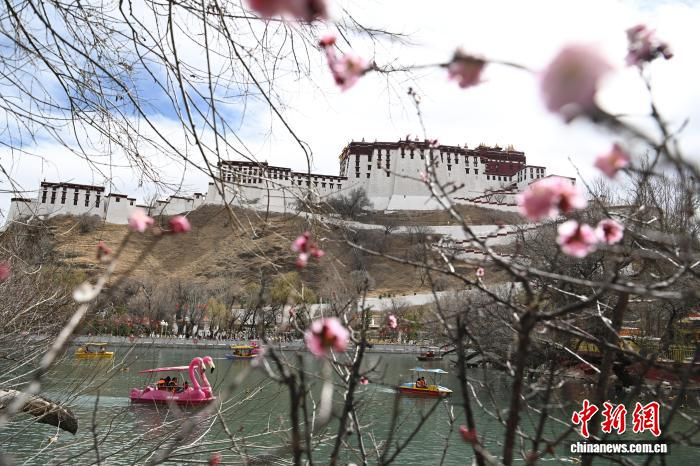 3月8日,西藏拉萨宗角禄康公园,桃花竞相绽放。阳春三月,古城拉萨杨柳发芽、桃花初放,春意渐浓。中新社记者 贡嘎来松 摄