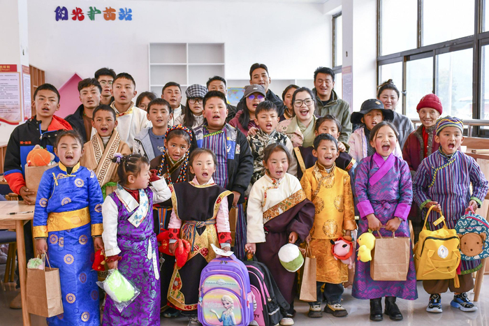 活动最后,孩子们并肩站在一起,拿起手中的礼物,齐声喊出“粤藏一家亲,民族团结共成长!”稚嫩的声音在多布湖畔回荡,一张张笑脸迎着春光,像一朵朵盛开的格桑花。