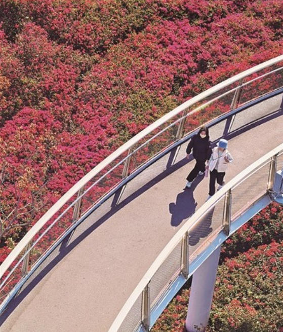 在山海健康步道悠然园,上万株三角梅灼灼怒放,漫山遍野,红红火火。悠然园依山而建,步道盘旋而上,与山体完美融合。步道上是观赏三角梅的绝佳视角,从这里俯瞰三角梅花海,红火的景象扑面而来,令人惊艳。市民刘先生表示,悠然园的三角梅开得格外旺盛,只要找准角度,就能拍出“人在花中走,好似景中游”的奇妙画面。
