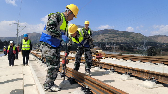 “我们针对渝昆高铁集复杂地质、长大隧道群、30‰连续长大坡道于一体的特点,研发应用了长大坡道铺轨、制动与精调成套技术,并配备先进工装设备与智能监测系统,确保铺轨安全和精度。”中铁十六局渝昆高铁铺轨施工技术负责人张延说道。