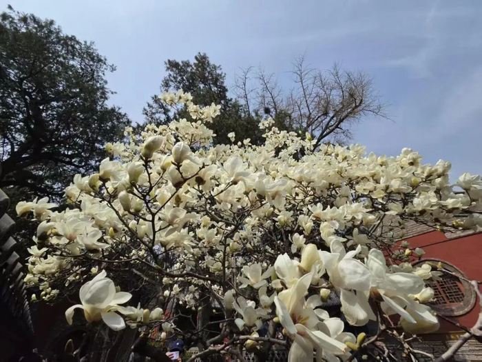 游人循着花香而来,在花树与古建间流连。有人举着手机,将繁花与飞檐一同框进镜头,定格红墙与春花的邂逅;有人凑近花枝,细细端详玉兰的纹理,让花香漫过衣襟;孩子们踮着脚尖,伸手去触碰低垂的花穗,眼里满是好奇。那尊饱经风霜的铜狮静立一旁,看遍了岁岁年年的花开花落,也见证着春日里的热闹与欢喜。