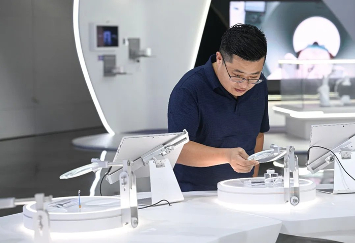 观众在海南自贸港重点园区——博鳌乐城国际医疗旅游先行区观看“永不落幕”国际创新药械展(2025年10月27日摄)。新华社记者 蒲晓旭 摄