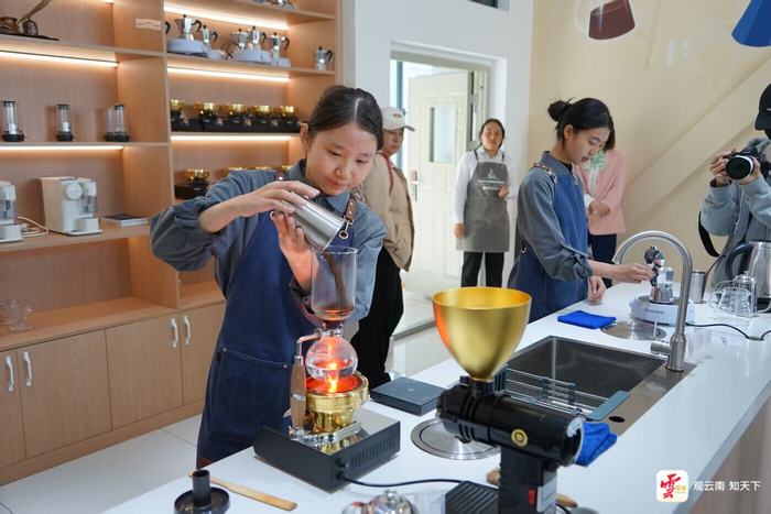 在实训场地,采访团实地观摩咖啡豆筛选、烘焙、手工冲煮、品质杯测、模拟开店、直播销售,以及咖啡产品量产等全程紧贴产业一线的实操课程。据介绍,学院依托市公共实训基地,建成6000余平方米教学实训场地,投资千万元打造专业咖啡实训工厂,配备国内外先进生产设备,设有大师室、杯测室、拉花教室等多个功能区,单次可容纳500人同步实训,打通课堂与车间的壁垒。