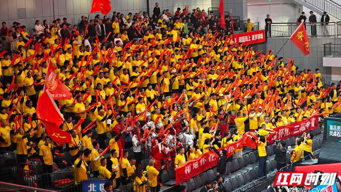 贺龙体育馆的看台上,由怀化球迷形成的一片“稻穗黄”格外醒目。