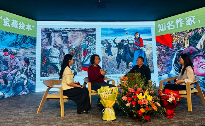 《进藏英雄先遣连》作者见面会上,绘者尤山(右三)、作者陆开武(右二)、责任编辑桑晓敏(右一)向读者们讲述创作过程。李萍 摄