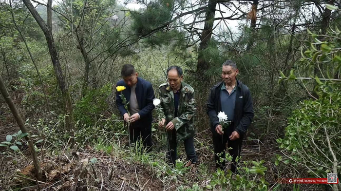 细雨蒙蒙,木奇岭上草木吐绿、杜鹃缀枝,空气中弥漫着淡淡的哀思。山上没有正式的墓碑,只有村民早年立下的一根树干,默默陪伴着长眠于此的8名无名红军战士。大家俯身清理杂草、培土修整,小心翼翼地献上白花,默默伫立、低头默哀,每一个动作都饱含着对英烈的崇敬与缅怀。即便自家先祖不在这座山上,菜岭村人祭扫英烈的传统,也从未有过一丝间断。