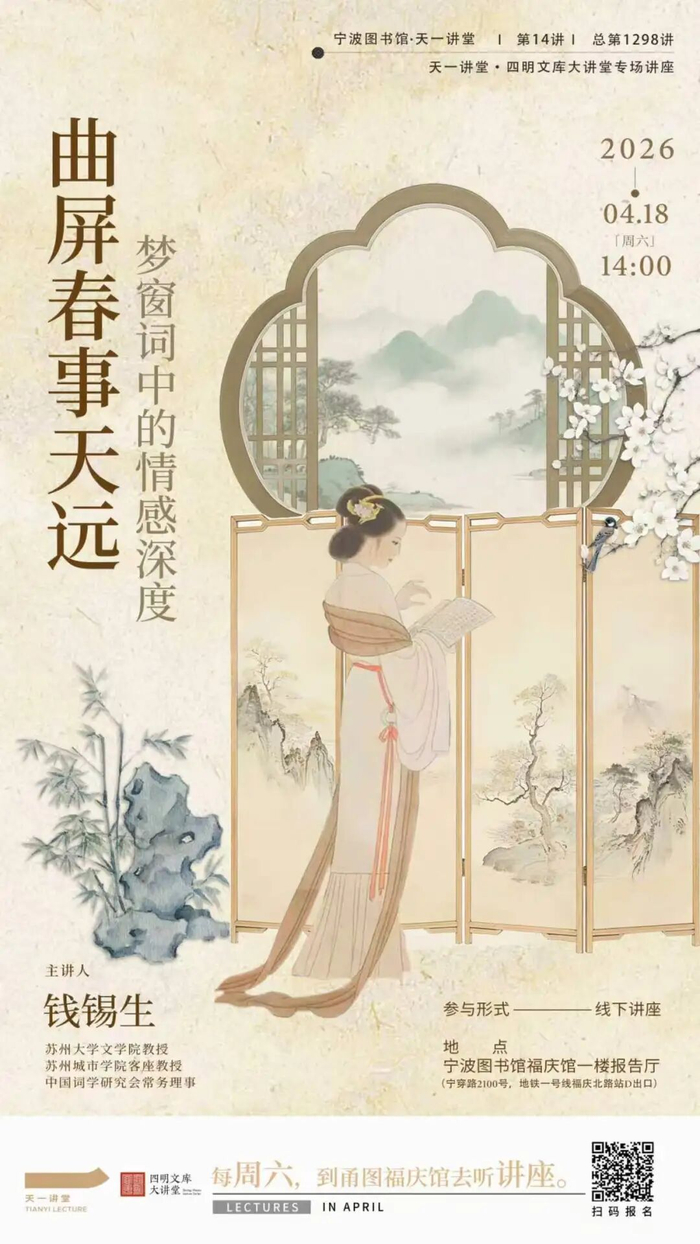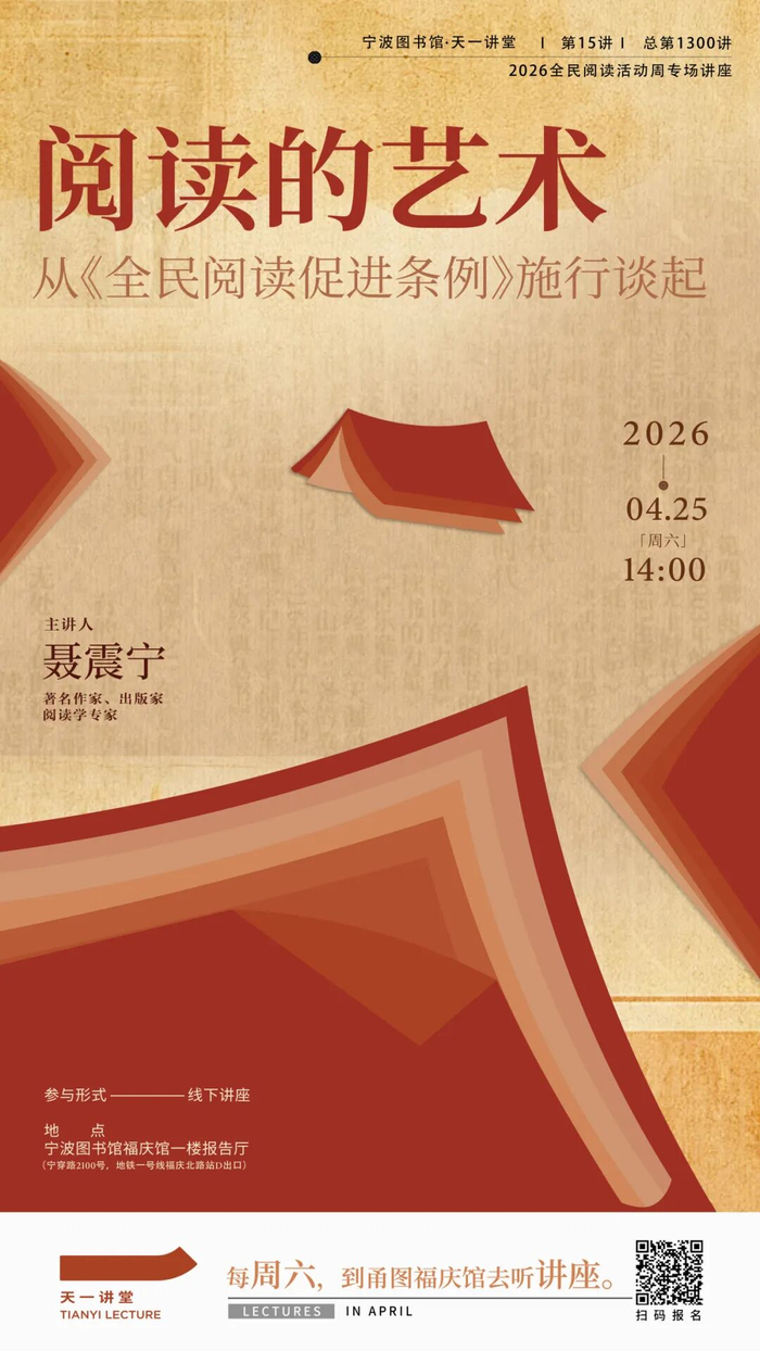 2026宁波读书月恰逢天一讲堂创建20周年,同时也将迎来《条例》施行后的首个“全民阅读活动周”,4月4日起,天一讲堂“文化五讲”星光熠熠,全民阅读第一提案人、著名作家、出版家、阅读学专家,第十、十一、十二届全国政协委员聂震宁,被誉为当代匈牙利文学的中国声音——祖籍慈城的2025年诺贝尔文学奖得主克拉斯诺霍尔卡伊·拉斯洛的主要中文译者、作家余泽民,北京师范大学文学院副院长,教授,博士生导师张莉,苏州大学文学院教授、中国词学研究会常务理事钱锡生等名家将陆续开讲,邀请广大市民共赴文化盛宴。