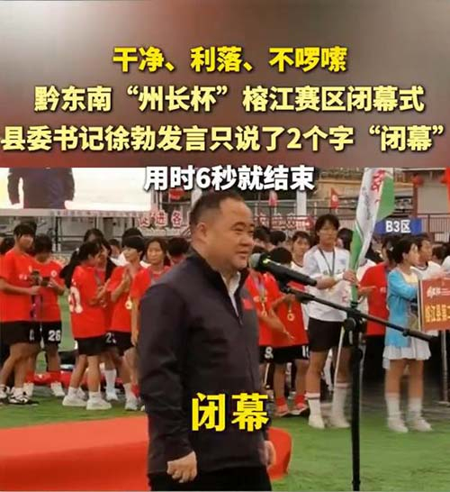 一句“闭幕”,加上登台的时间,总共短短6秒,却如清风拂面,在舆论场中激荡出久久回响。近日,贵州黔东南“州长杯”足球赛闭幕式上,县委书记徐勃在足球赛闭幕式上的极简发言,看似不经意,实则蕴含着深刻的为民情怀与务实的治理智慧。这6秒钟,不仅为一场赛事画上了利落的句号,更在群众心中种下了对清新政风的由衷认同。