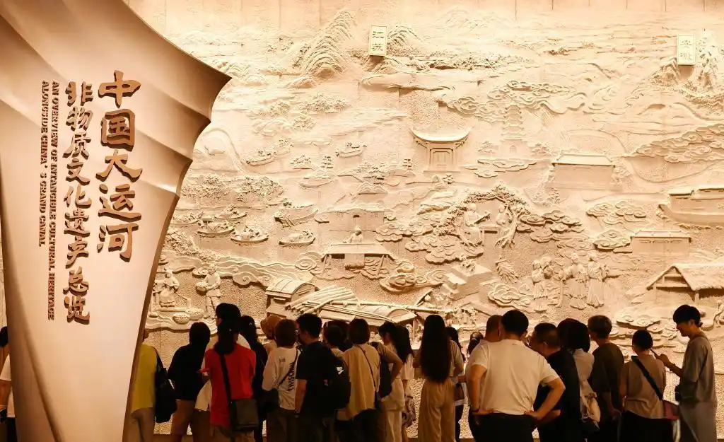 走进中国大运河非物质文化遗产展示馆总览厅,抬头可看见一条“星河带”,脚下则踩着“运河带”,迎面一块巨大浮雕映入眼帘。这是目前京杭大运河沿线规模最大的非物质文化遗产集中展示地,展示了大运河流域沿线8省(市)的航运风貌、代表性建筑景观和非遗代表性项目,尽显大运河沿线的精彩与壮阔。