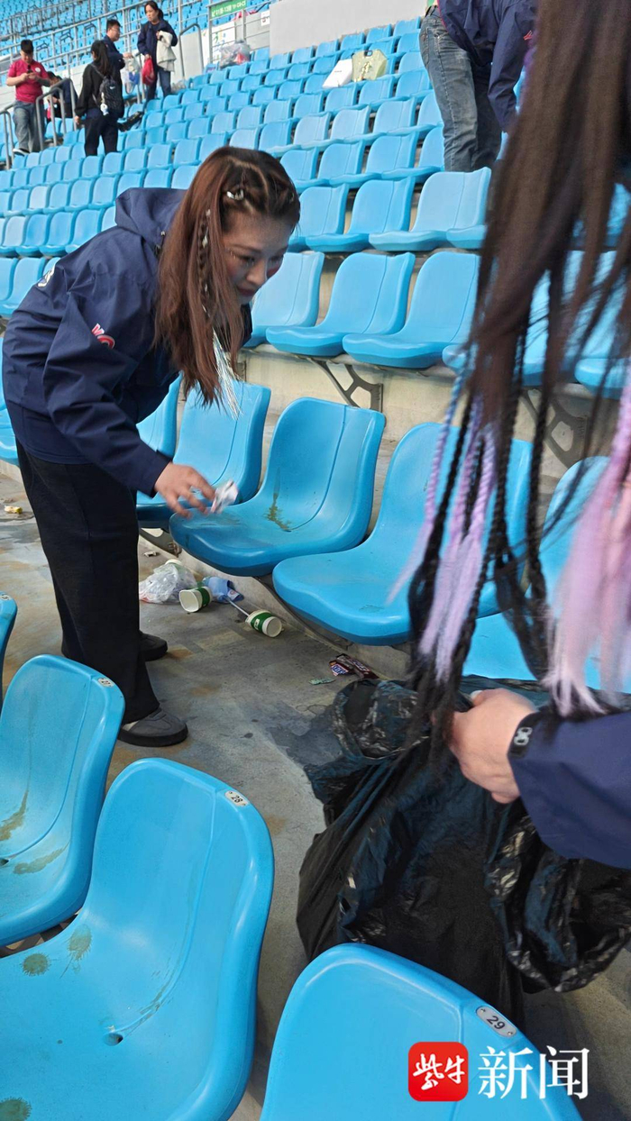 在看台的另一侧,一位梳着彩色发辫的女球迷正和同伴一起将捡起的纸屑装进袋子里。面对记者的镜头,她真诚地表示:“我们每一场比赛,都要求把我们啦啦队所在区域的垃圾全部捡完。这是我们每个公民应该要做的事情。我们不单单是支持足球,也是为了我们盐城这座文明城市做出自己的一份贡献吧。”