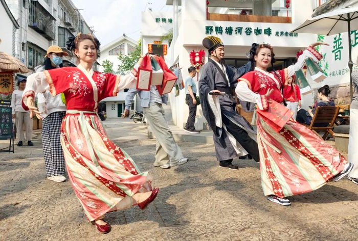 在普洱市图书馆,孩子们在“指尖非遗”金箔画体验中用巧手雕琢梦想。思茅老街里,普洱文艺轻骑兵王智宇扮成“诸葛亮”NPC,将《阿佤人民唱新歌》与流行金曲混搭演唱,为游客送上茶叶、咖啡等小礼物,在社交媒体上“出圈”。没有固定舞台,随机问答互动,演员与游客近在咫尺,在轻松愉快的交互氛围中,场景“活”了起来。