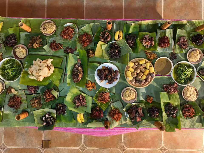 “在普洱吃什么?”不少到普洱的游客在网上发帖求攻略。歌舞伴餐的餐厅频频被推荐,位于思茅区的佤王宴餐厅,就是其中的代表。走进餐厅,墙上悬挂的牛头骨首先映入眼帘,角落里摆放着佤族日常劳作的器具,木鼓静立一旁,仿佛随时会传来远古的召唤。