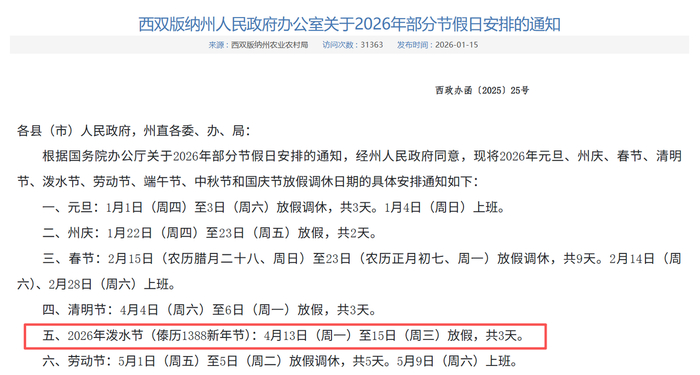 根据《西双版纳州人民政府办公室关于2026年部分节假日安排的通知》,2026年泼水节(傣历1388新年节):4月13日(周一)至15日(周三)放假,共3天。