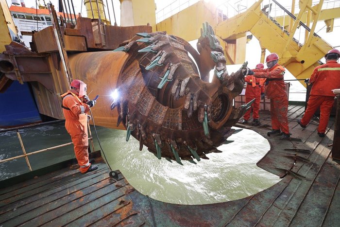 2022年11月,工作人员在被誉为“造岛神器”的“天鲸号”绞吸式挖泥船上安装铰刀。视觉中国 图