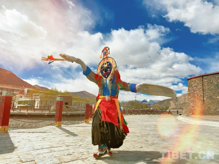 阳光之下湘巴藏戏队队员身着藏戏服进行排练