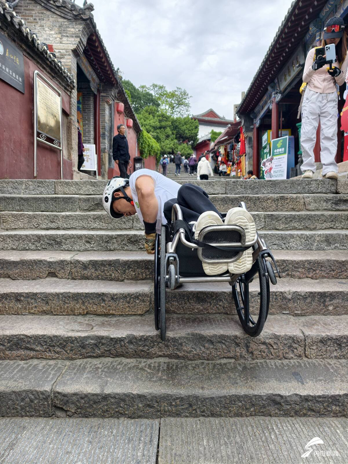 头戴安全帽、佩戴护腕手套、系好安全带,刘阿雄以一只手撑住台阶,身体前倾,依靠双臂的力量带动轮椅与身体,一级一级向上攀爬。泰山部分山势陡峭、石阶较为狭窄,对攀登者的体力与意志都是一大考验。“泰山是治嘴硬的地方,今天能爬到哪里看结果。”刘阿雄每攀爬一段便稍作休息,口中喊着“我命由我不由天”“加油”。历经约40分钟,他从关帝庙顺利攀登至万仙楼。在攀爬过程中,100多斤的身体重量全靠双臂支撑,手臂因持续发力而颤抖,但他始终没有停下脚步,不断摸索路线、破解难点,用毅力战胜每一级台阶。