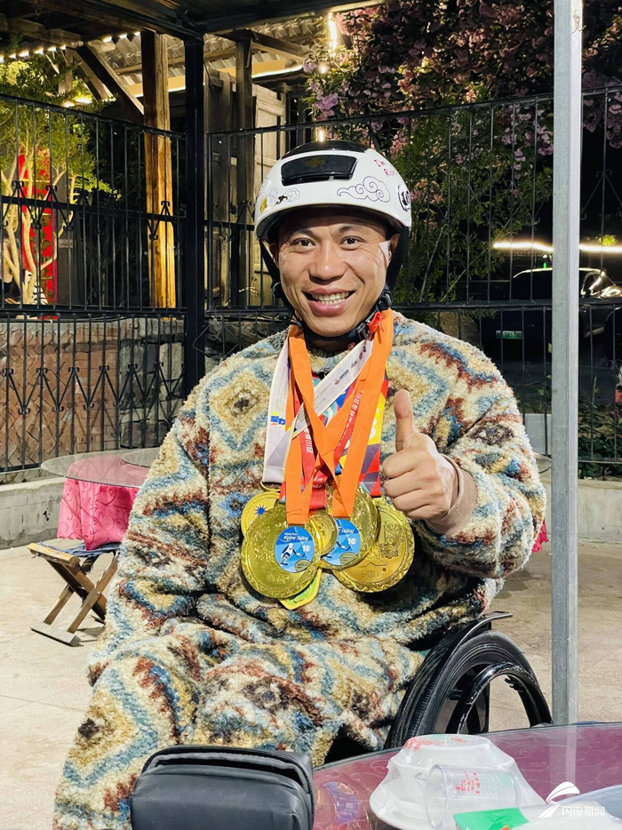 今年38岁的刘阿雄,来自四川内江威远县。2012年,一场意外车祸让他从高处坠落,导致下半身瘫痪,从此与轮椅相伴。从能跑能跳的工程从业者,到终日困于方寸之间,刘阿雄也曾一度消沉封闭。但在漫长的挣扎后,刘阿雄选择以另一种方式“重新站起”——不是用双腿,而是用强大的双臂与不屈的信念。