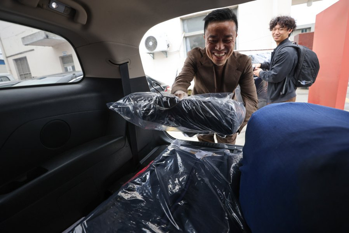 毛永康亲自将定制成衣打包从工厂搬上运往南外滩轻纺面料市场的专车。