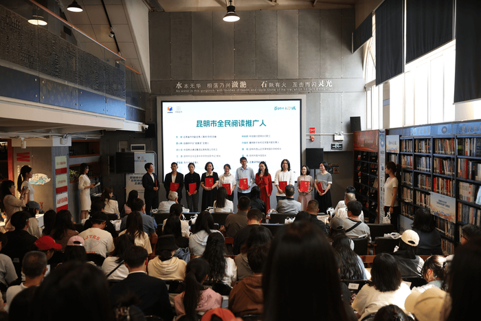 现场还举行了昆明市全民阅读推广人聘任仪式,包倬、楚小韩等10人受聘担任昆明市全民阅读推广人。作为曾用热爱与坚持点亮阅读之光,传递榜样力量。受聘担任昆明市全民阅读推广人的他们,现场发起了“阅读推广人1+1计划”:自2026年4月起,每月由一位全民阅读推广人推荐一本好书,身体力行落实一件与阅读相关的实事。力求将榜样的力量转化为可持续的全民阅读推广行动,积极助力书香昆明建设。
