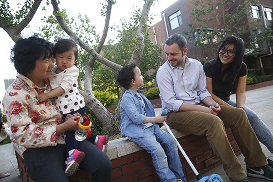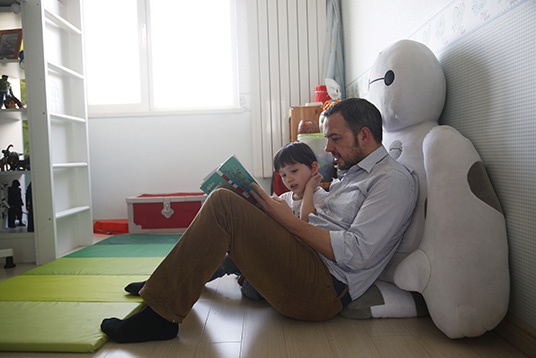 5月16日的下午,阳光正好,在滨海新区开发区的一户住宅内,Chris和他的五岁半的儿子Nial在房间里,靠着大白,一起读着儿童读物。