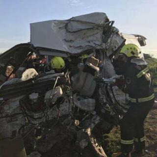 视频:面包车车头被撞毁 当地消防人员正紧急救援